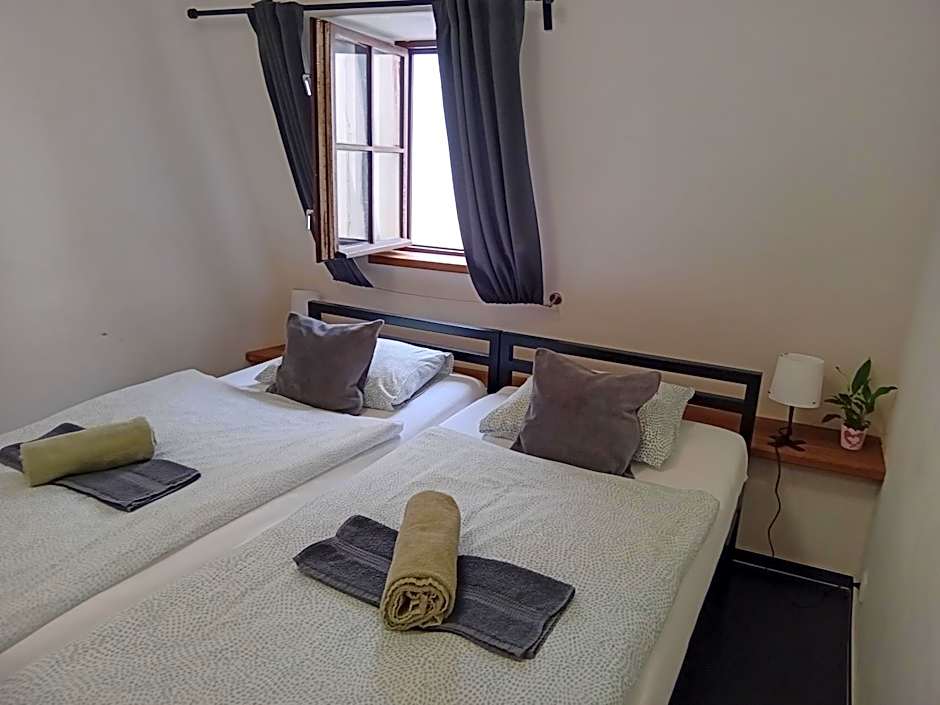 Room options span a mix of private and shared spaces. The Comfort Duplex offers a kitchenette and a private bathroom, accommodating 2 adults. The Maisonette Apartment covers 409 square feet and sleeps 2 adults and 1 child, with a sofa bed and a king-size bed. For budget-conscious stays or group trips, dormitory configurations such as a 6-bed or an 8-bed room are also available, alongside other single and shared-bathroom layouts.